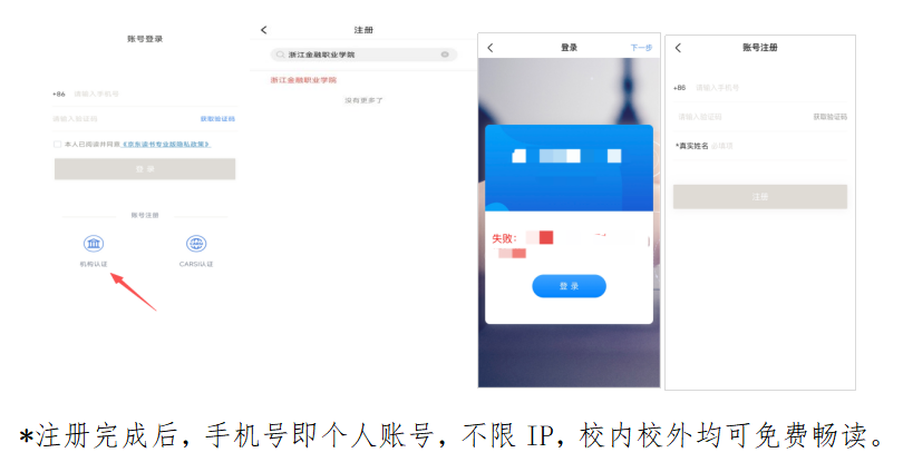 首次访问的读者需要连接校园网WiFi后,进入京东读书专业版平台,点击【机构认证】--搜索【浙江金融职业学院】--连接【校园网WiFi】完成身份认证,根据页面提示输入手机号、姓名等信息完成注册。