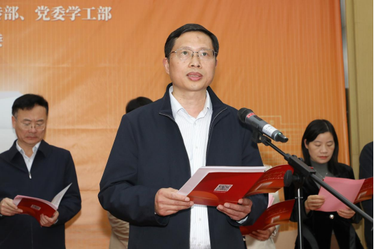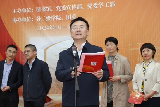 张鹏超作开幕式致辞。他指出,以习近平同志为核心的党中央高度重视全民阅读工作,学校凝聚全校力量举办“书香献礼,阅向未来”第十五届读书节系列活动,是推动我校阅读推广工作走深走实,全面提升育人水平的重要抓手。学校将进一步贯彻落实八部委印发的《全国青少年学生读书行动实施方案》,引导和鼓励全校师生在经典阅读中提升文化素养、坚定文化自信、增强文化自觉,努力建设具有金院特色和浓厚书香气息的校园文化。