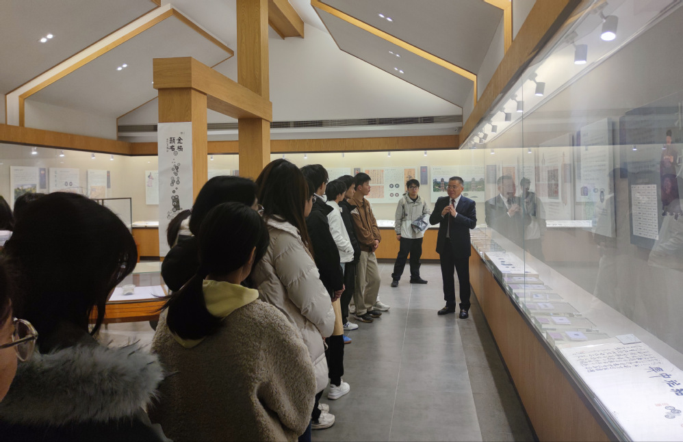 活动现场,博物馆馆长陈宝祥先生热情接待并亲自带队讲解,引领大家沉浸式参观“宋韵流光——钱币文化与名城绍兴”主题展览。陈馆长结合自身四十载钱币收藏经验,生动解读了范仲淹《清白堂记》相关典故、宋高宗驻跸越州“绍祚中兴”的历史背景,以及陆游《示儿》中蕴含的家国情怀与宋六陵的南宋遗韵,让同学们在近距离接触钱币实物的过程中,既领略到金融器物的演变历程,又感受到绍兴深厚的文化底蕴,现场提问不断、互动热烈。